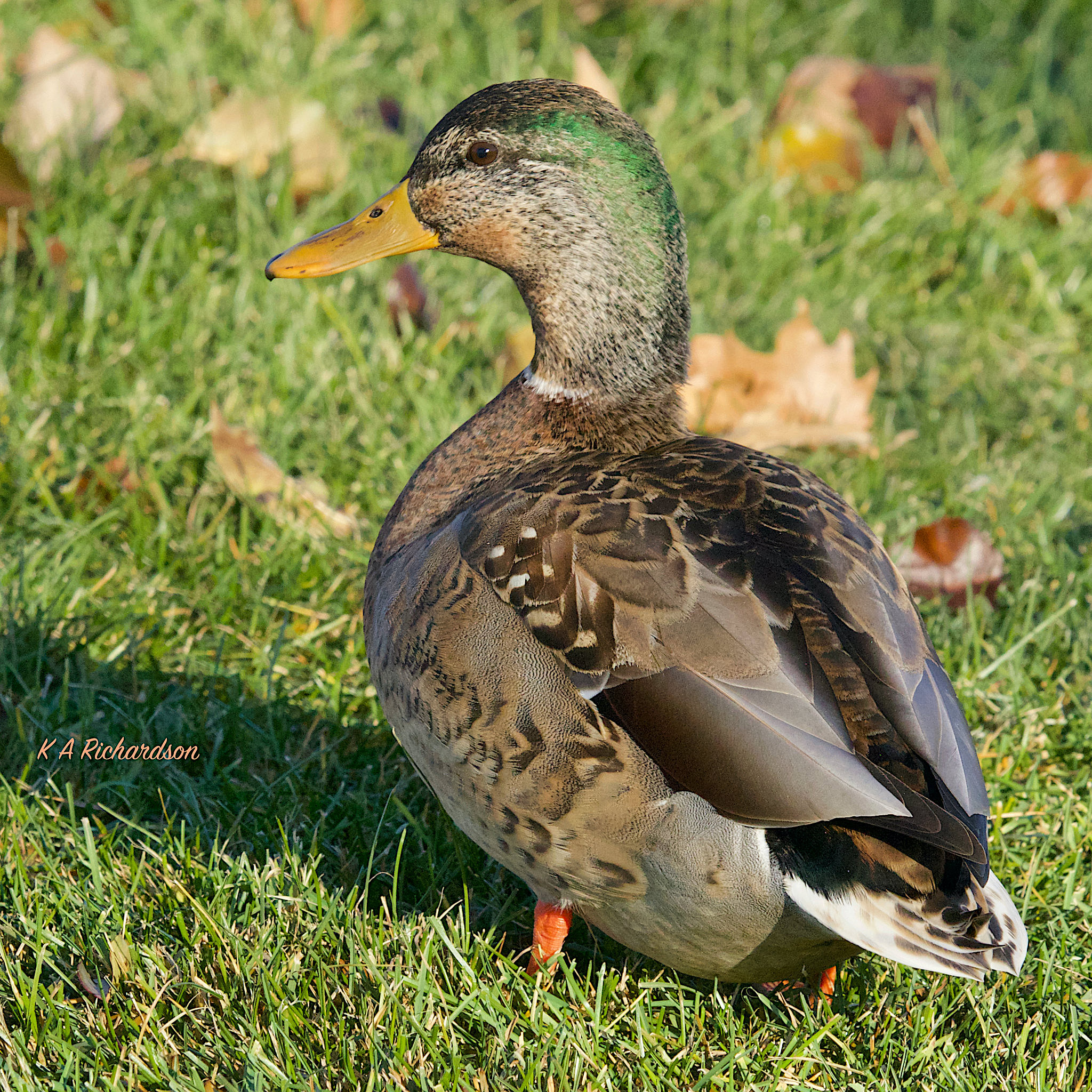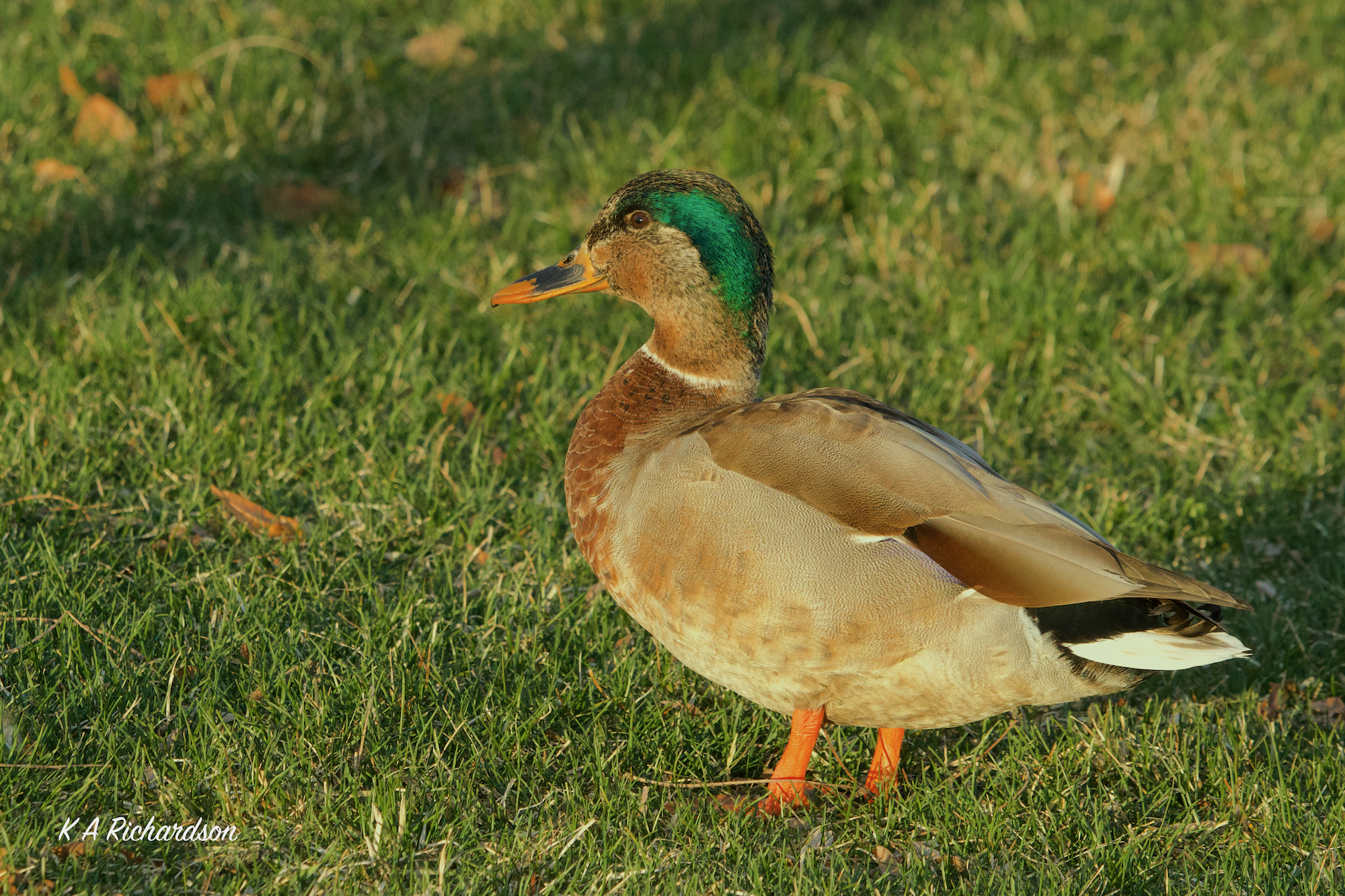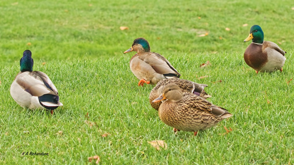 Not a great photo, but it illustrates how Homher differs from both drakes and hens in the ‘normal’ Mallard range. While the other ducks tolerate her, there’s no close connection. She wanders around with them and goes back and forth between Teal Pond and this grass area near Kelowna Rec Field, Kelowna, BC.