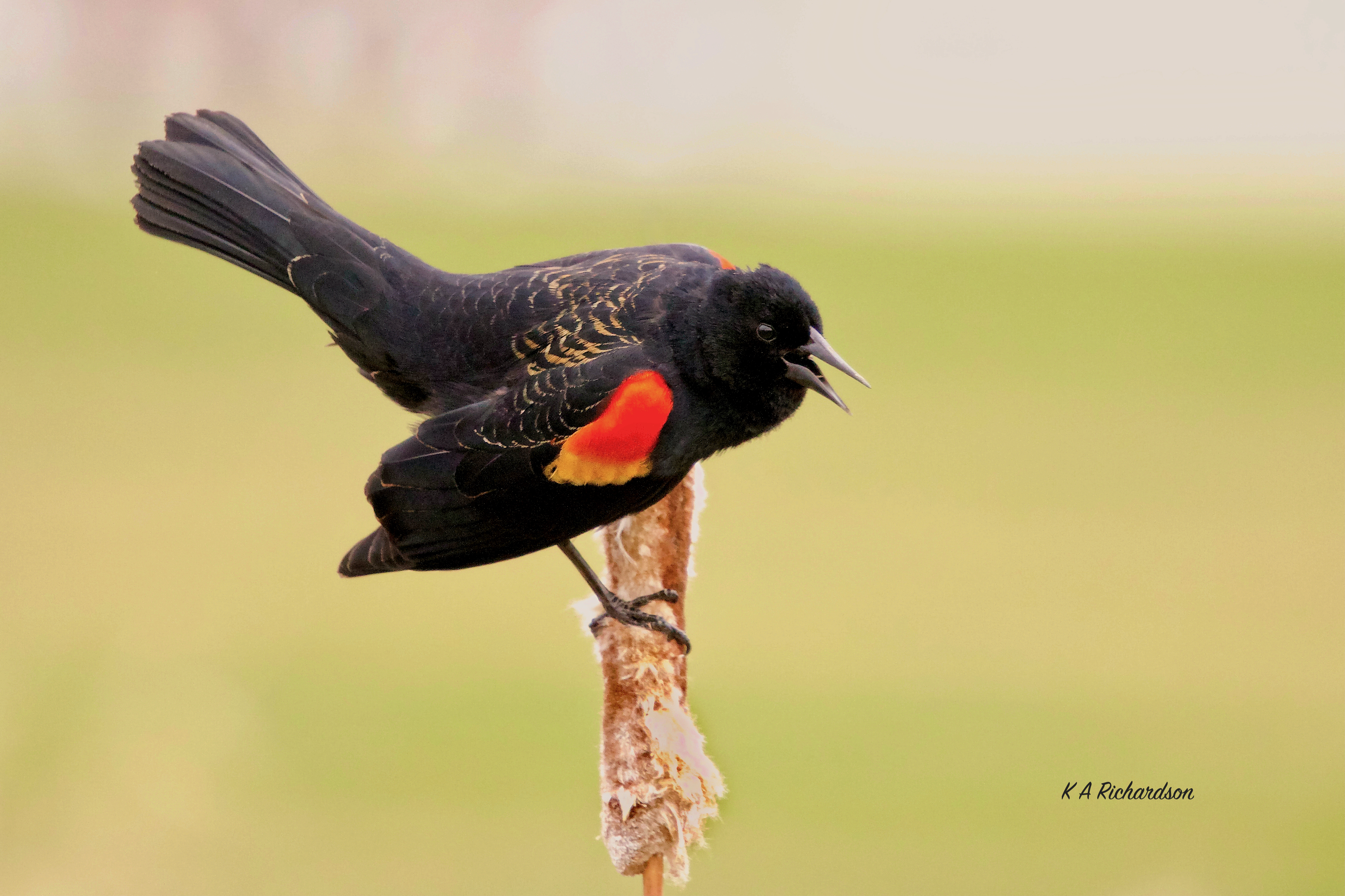 Randy Redwing on April Fools Day plays King Kong!Red-winged Blackbird (Agelaius phoneceus) aroused at Peninisula Pond, Thomson Marsh, Kelowna, BC.Red-winged Blackbird males putting on a show.