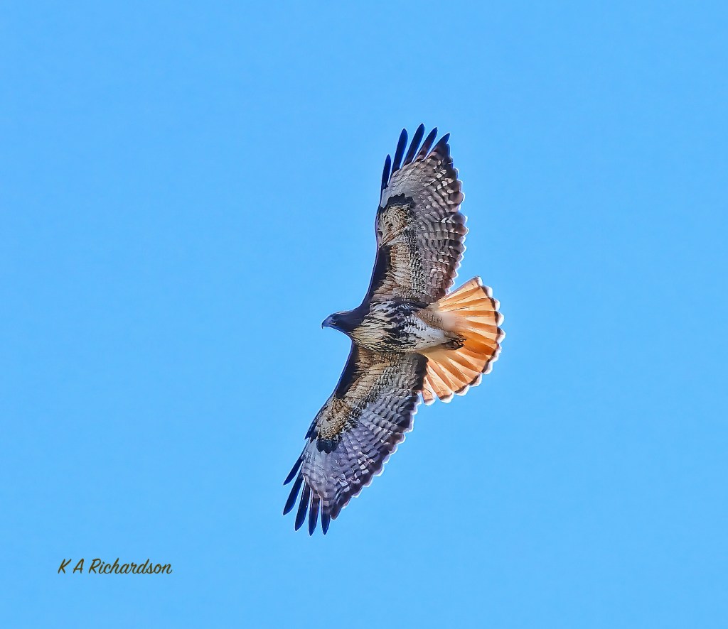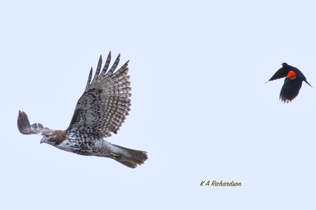 An intriguing feature of this species is the great colour variability among its indvIduals. The harassed fella (posted above the kestrels above the bluebird), as you can see, has a white throat and overall lighter tones including a tail that’s not very ‘red’ compared to the one to the right here, soaring above Beaver Lake Road in Lake Country. This one has classic hues!