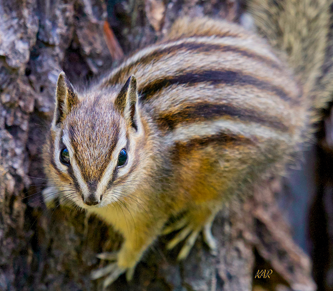 While some lovely Yellow-Rumped Warblers foraged furtively along the shore, we didn’t see much else in terms of bird life. This little Yellow-Pine Chipmunk was a delight to watch as ate our sandwiches. As he got used to us, he moved from shade into better light and allowed me a few fotos.
