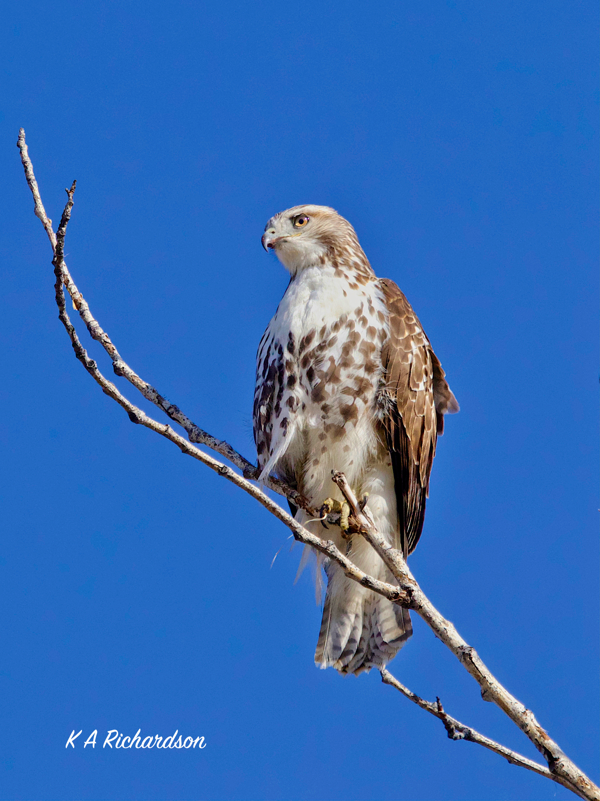 Whitey II, a Red-tailed Hawk (Buteo jamaicensis), probably a Harlan’s variety, in residence at Munson Park, Kelowna, BC from mid-winter into early spring. Am pretty sure I’ve seen him/her in other areas south of the Park as well. Below you’ll find two more shots of her/him perching.