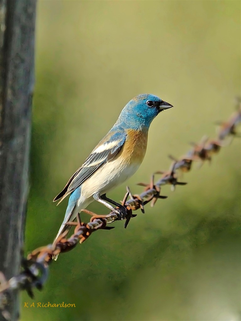 Lazuli Bunting “Similar to adult, but first-year male tends to have paler and duller blue feathers with brown or buff tips, especially on head, nape, and back, resulting in variable dull blue-brown, blotchy appearance.” (Cornell LoO)