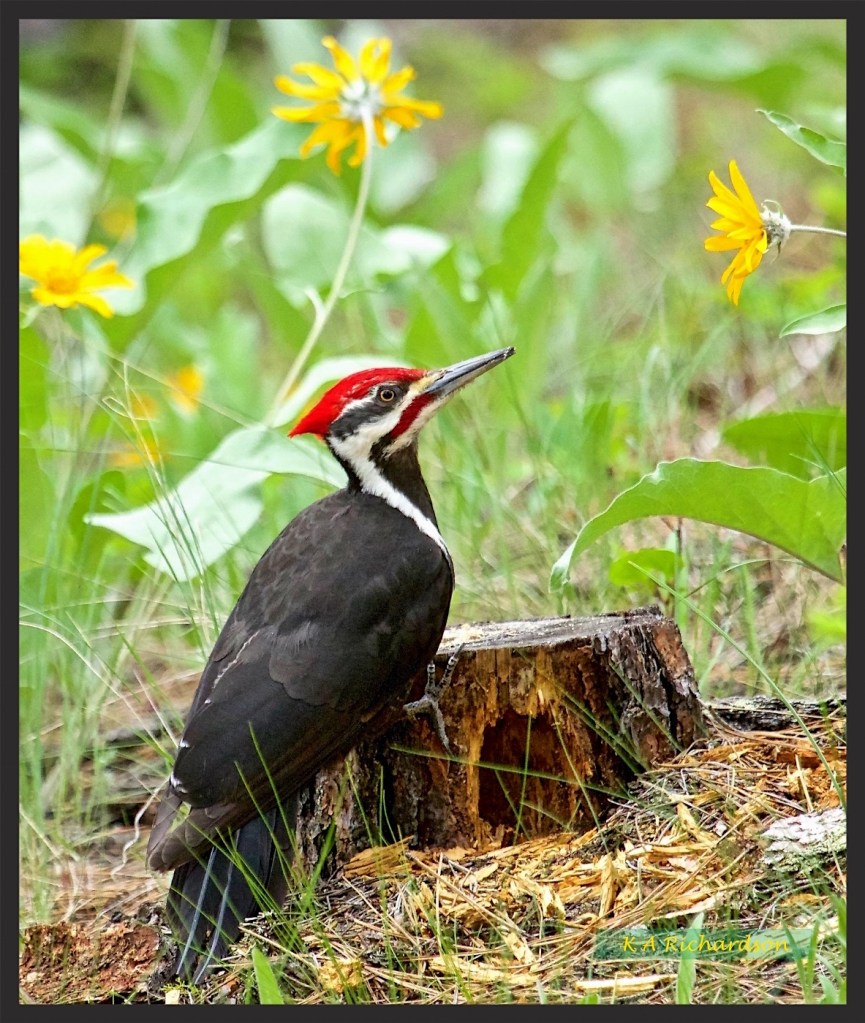 pileated-woodpecker-male-3 PIWOs are often found on the trunks of trees; in this case the trunk had been exceedingly shortened….