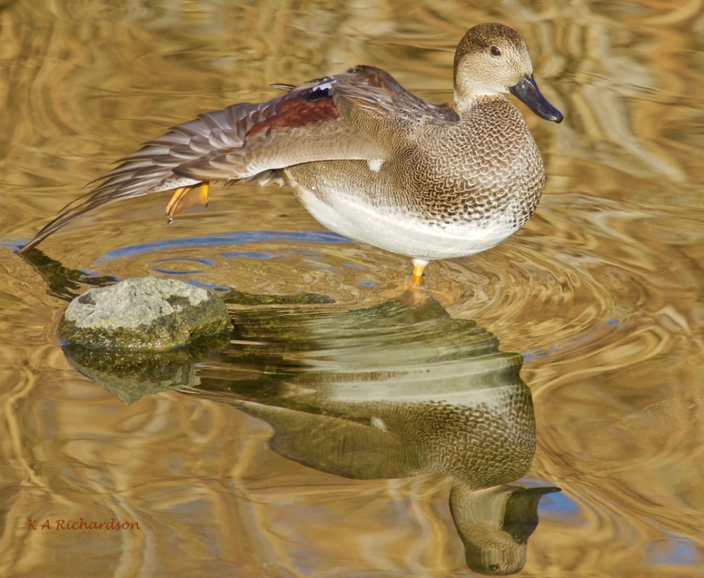 Gadwall drake stretching