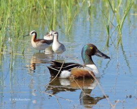 Northern Shoveller with W. Phalaropes, mid May NSHO drake with Wilson’s Phalaropes, Robert Lake, Kelowna, BC.