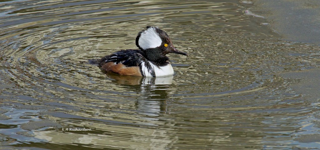 Hooded Merganser drake (Lophodytes cucullatus) Belmont Pond, Kelowna, BC. First of the year, still lots of ice on our little pond….
