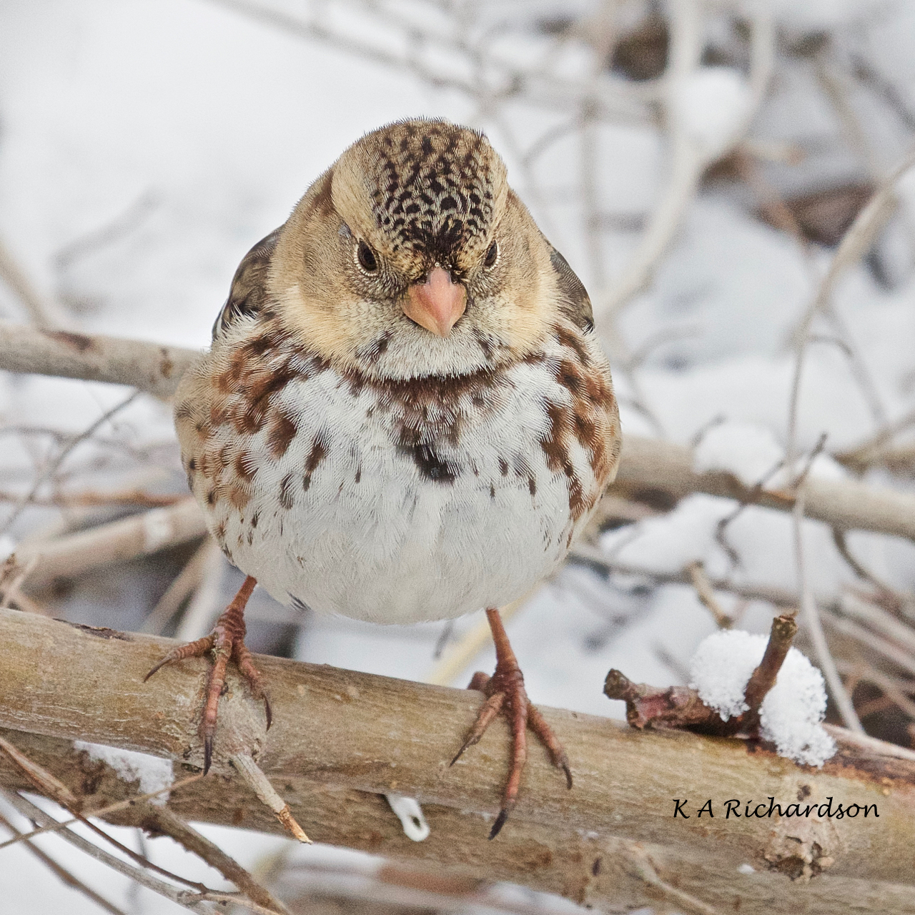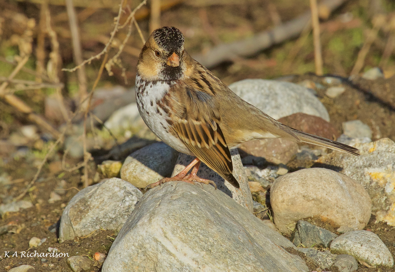 More important, from a birding/photography standpoint, was the accidental creation of an environment that was very much appreciated by our local Song Sparrows and White-crowned Sparrows, and four (some claim five) accidental tourists who normally spend their winters east of the Rockies — Harris’s Sparrows: