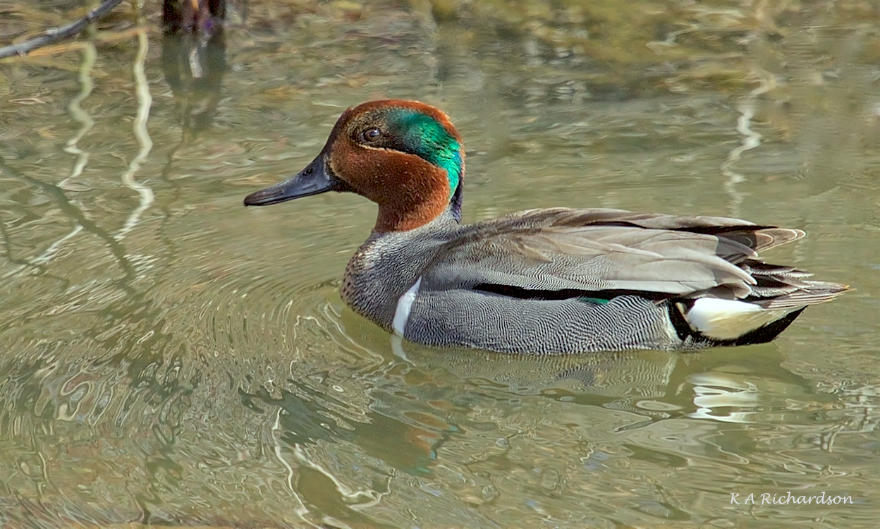 Besides his own photos I found a useful opinion Mr. Gustavsson had offered on on someone else’s work, as well, that sets out his criteria of judgment in the hybrid vs intersex argument (quote copied and edited to remove Internet links that no longer work): “I [d]on’t think it is a hybrid at all but what we call an intersex, i.e. a pure Mallard with both male and female features. Odd but not too uncommon. This one is the most extreme that I have heard of [dead link removed]. It was ringed [banded?] as a typical female but 10 years later looked like a rather typical male except for the bill which is still of a female type (it is the bird in the front I am talking about!!!!!!!!!!!). Some other examples, mainly my own [dead links removed]…. As you can see there are different degrees of masculinity and I think yours is rather typical. Black on the bill like in a female, green on the head green from the eye and backwards/downwards reminding on an american wigeon [sic], a mixture of male and female feathers along the side of the body and more or less obvious male type “hooks” on the tail.Moulting [eclipse] male birds is the big pitfall but should not be a problem at this time of the year, [as they] do usually not have black on the bill or only a black mid rib on the culmen [upper ridge of a bird’s bill] and usually have a more mixed pattern of colour on the head — not the typical limited one that your bird has.” [bold face and square brackets – [ ] – are mine – KAR]