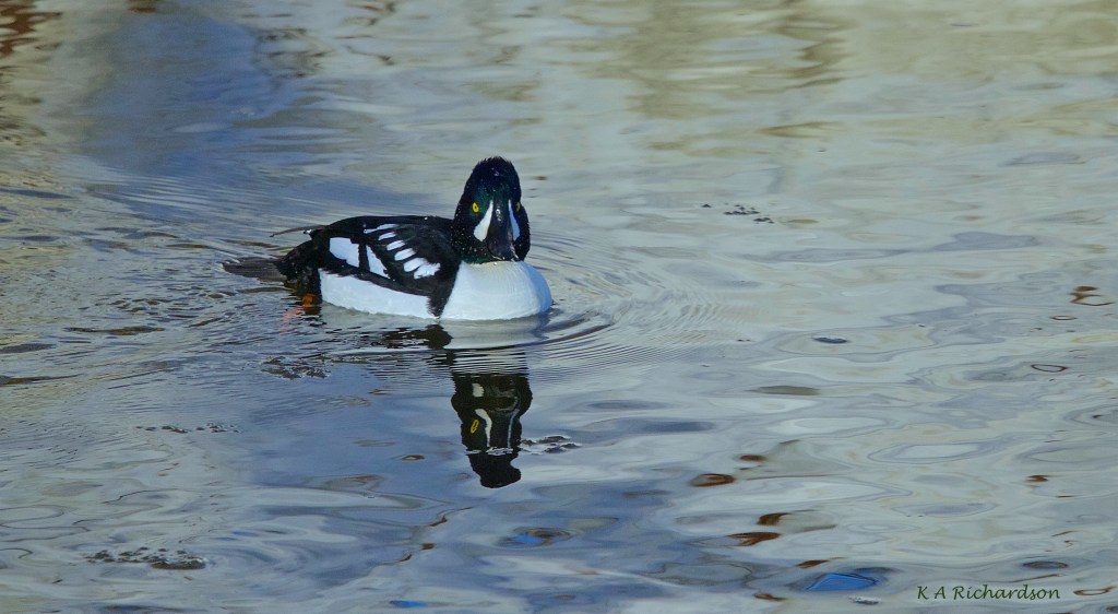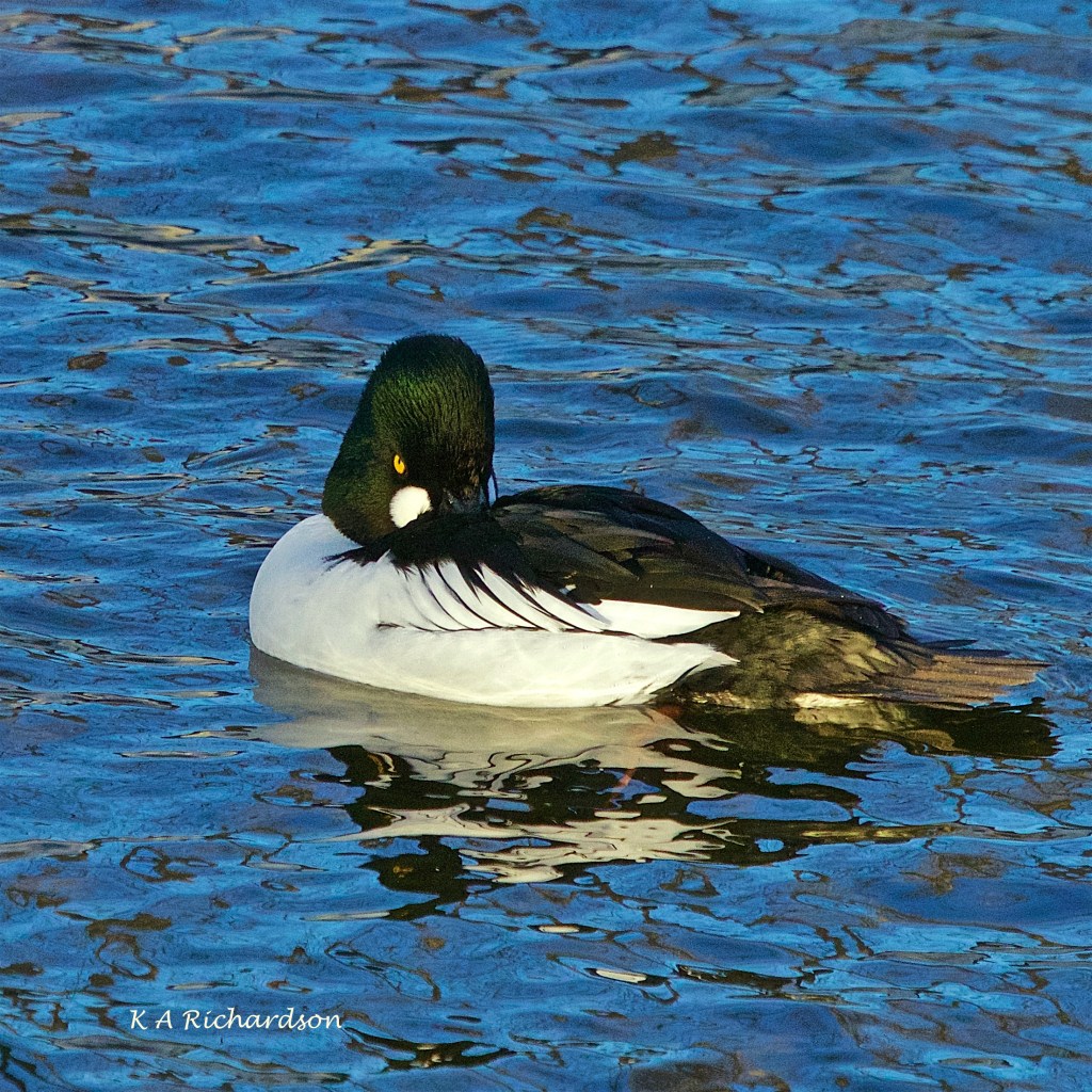 On the 26th, with only limited light, went back again and there they were — the usual raft of COGOs plus, I noticed almost accidentally as they’re quite unexpected here this time of year, a single pair of Barrow’s Goldeneyes, just waiting to be recorded. The COGOS seemed more hungry than were wary on this occasion and gave me pretty good access. The BAGOs were much less secured, but allowed a few shots. The light, however, was not what it can be, and the results while okay were not great.