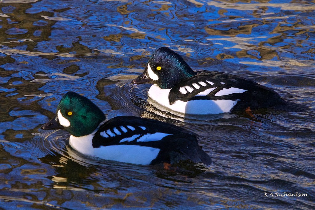 Goldeneyes (Bucephala clangula) /(Bucephala islandica) Mission Creek, Kelowna, BC.